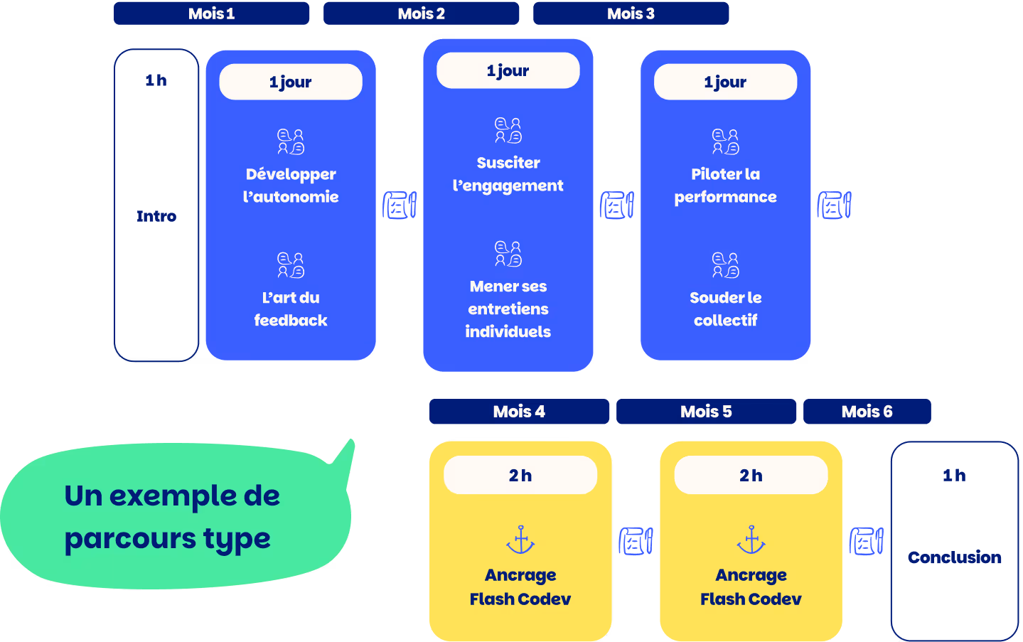 Vos managers n’ont pas besoin d’une parenthèse de 2 jours remplie de bonnes intentions. Ils ont besoin qu’on les aide et qu’on les outille afin de transformer durablement leurs pratiques. Mais transformer ses habitudes exige du temps long et de la régularité. Nos formations s’étalent sur plusieurs mois, avec un rythme pensé pour ancrer les bons réflexes :